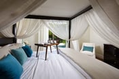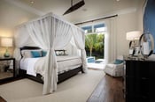 At the end of the evening you can retreat to the Master Bedroom where a king-size canopy bed with gauzy sheers awaits you and welcomes sweet dreams of sunshine and coastal breezes. To prepare for the dream-filled night, you can pass the bedroom’s walk-in closet to the spa-like master bathroom where Allen has created a serene, Zen-like atmosphere with a dark walnut floating vanity with marble countertops, a glass title backsplash, porcelain tile flooring and walls, and a freestanding tub. Of course, you can always escape through the sliding glass doors in the shower to absorb the beauty of the private master garden with an outdoor shower, pebble stone flooring, and wall fountain, and plants.