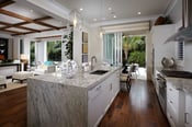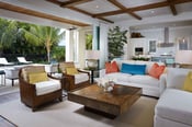 That feeling begins the moment you step foot on the natural walnut wood floors throughout the main living area on the first floor of this 4,227 square foot home. The neutral flooring is combined with off-white background to serve as a prime background for the bright and fun colors used in the design. Melissa Allen of Romanza Interior Design has made the West Indies home pop with vibrant colors such as rain forest citrus, teal, coral, butter, and eggplant. The combination of a neutral background and the energetic tones of the accent colors really capture the island feeling, and we haven’t even reached the outdoor living area of the estate home.