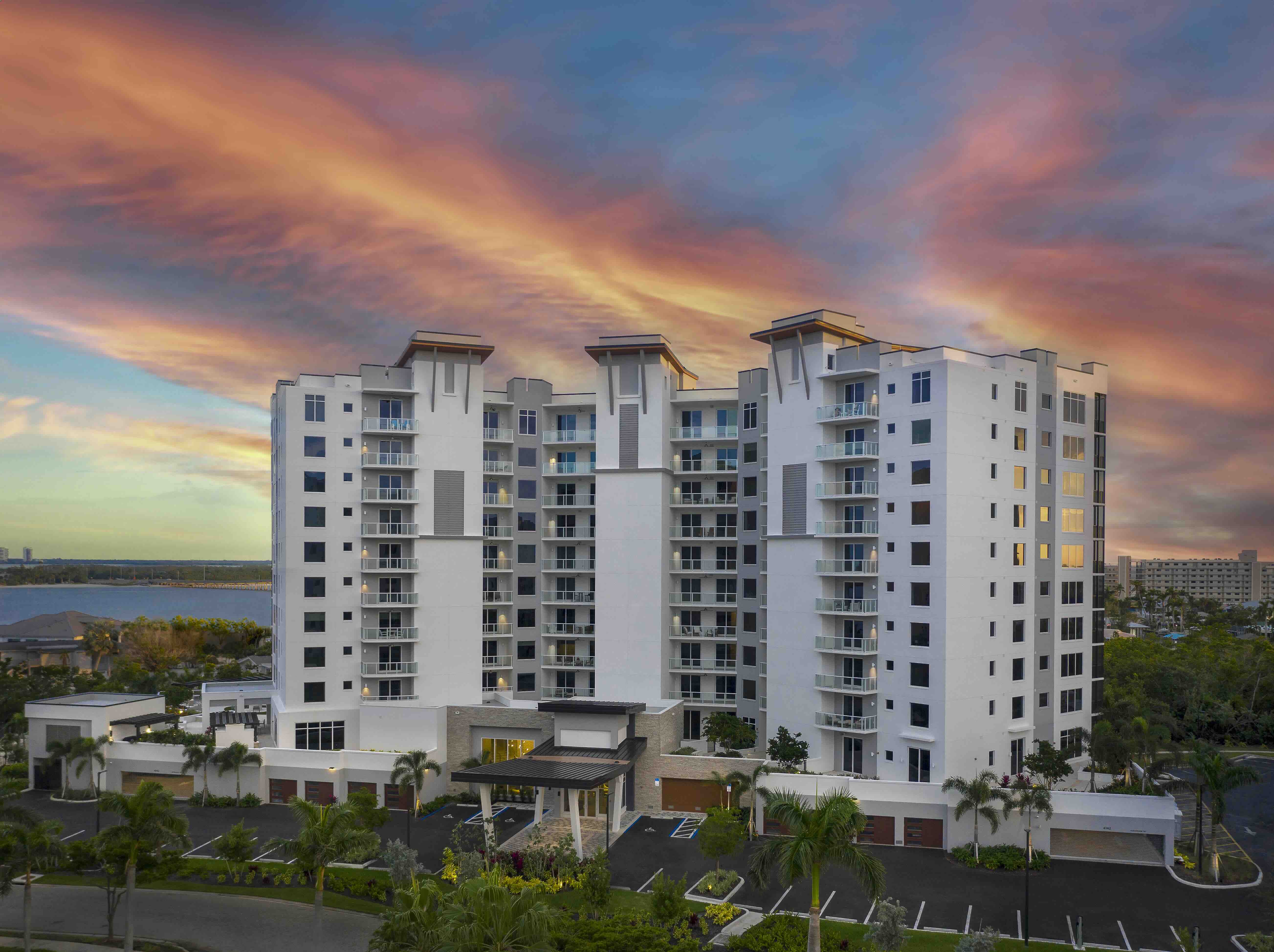 Grandview, an 11-story luxury condominium tower, is the last to be built in the gated community of Waterside at Bay Beach on Estero Island. Its stunning condo residences provide panoramic views of Estero Bay and the Gulf. Nestled on the southern tip of Fort Myers Beach, Grandview invites residents to enjoy both the bliss of beach and water activities, along with the excitement of nearby Naples.